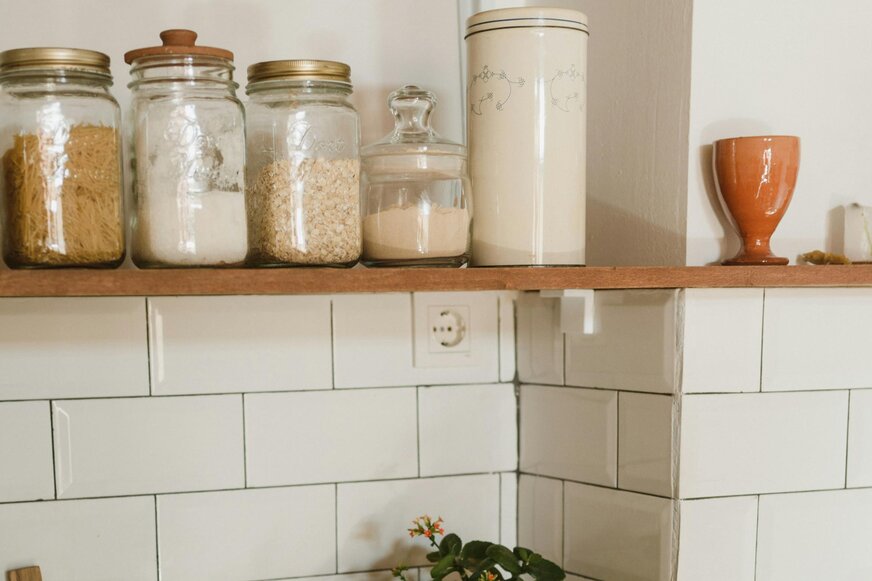 Invest in glass containers. Display your rice, flour, seeds, sugar, and other frequently used items in glass containers to keep clutter at bay. If you buy in bulk, swap the glass for food-grade gallon buckets.