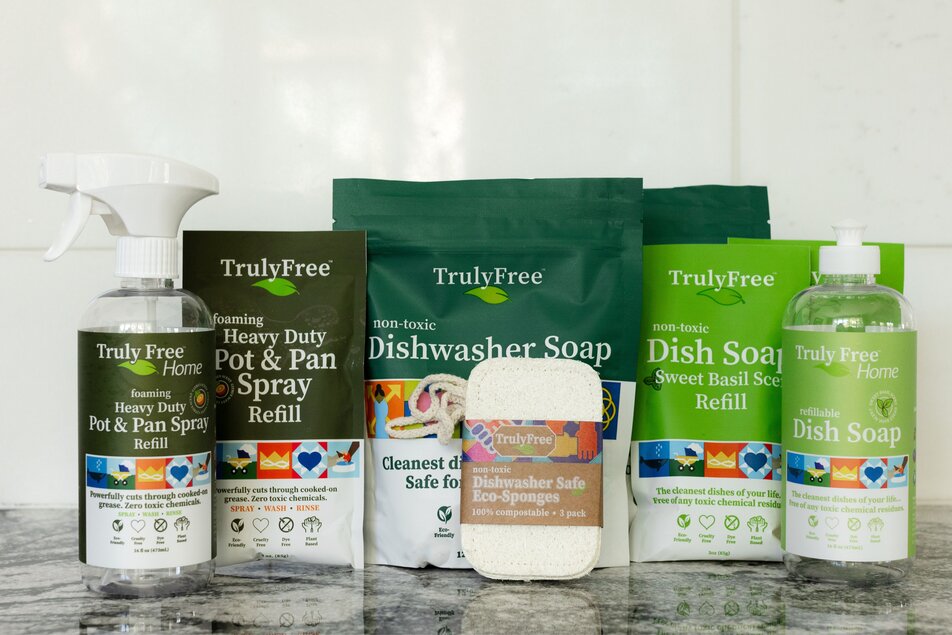 After each use, give your board a quick rinse with warm water to remove any loose bits of food. Use a non-toxic dish soap, like Truly Free Home Dish Soap, to scrub off any food remnants or stains. If you've been cutting raw meat or fish, it's especially important to clean the board immediately to avoid cross-contamination.