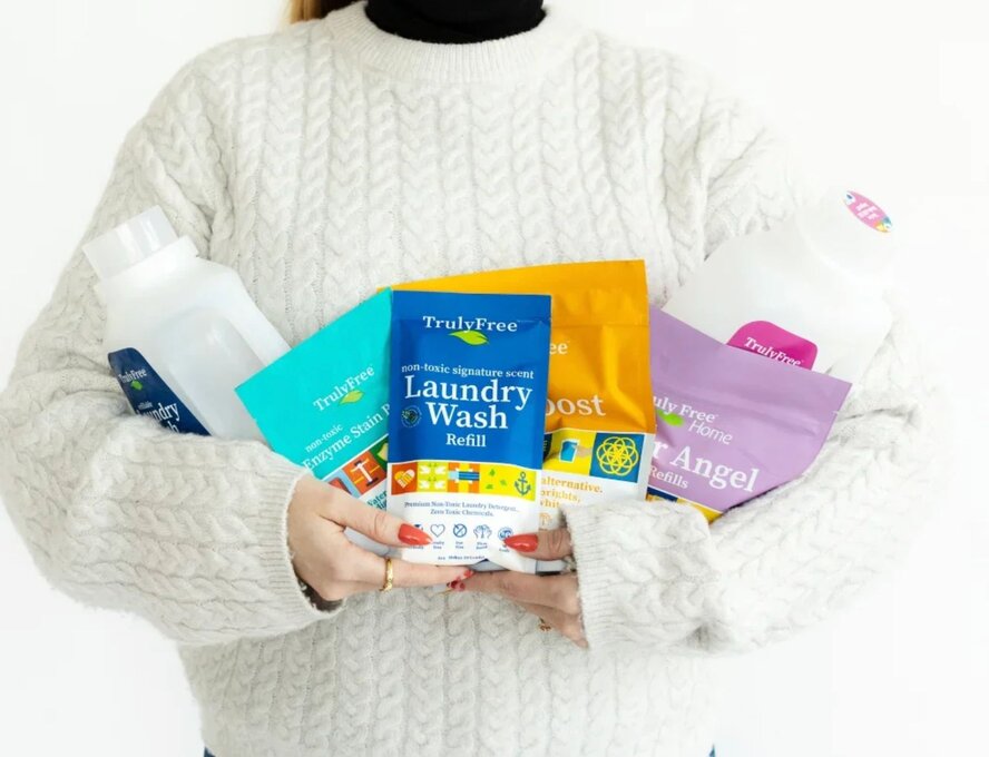 Swap toxic detergent and fabric softener for a non-toxic laundry detergent and safe fabric softener alternative with Truly Free Home non-toxic Laundry Wash and Softening Rinse.
