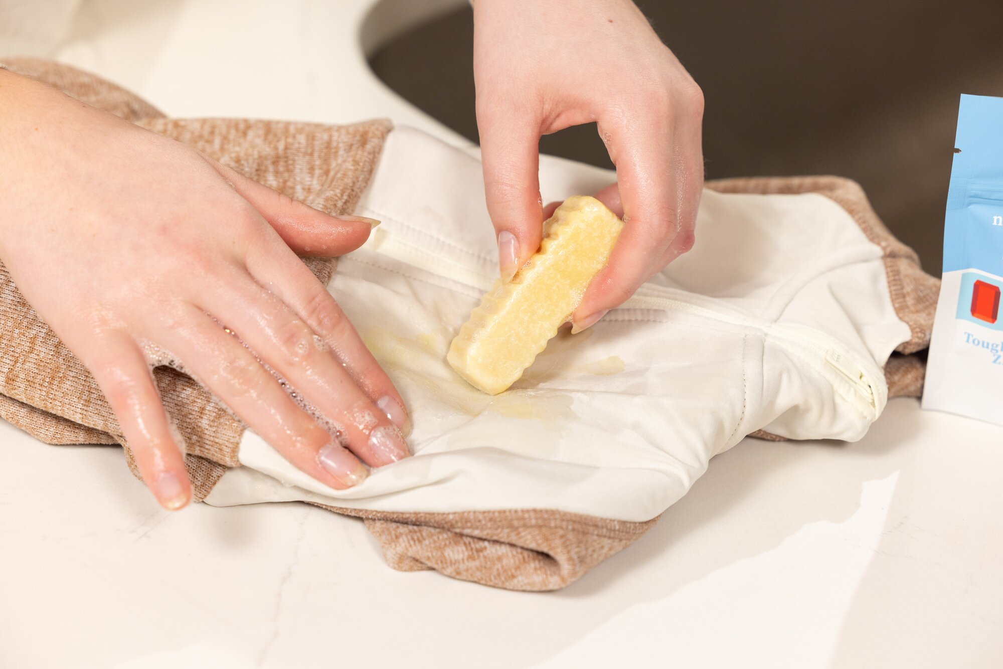 4. Agitate Gently - Rub the fabric together or use a soft brush to help lift the residue.
