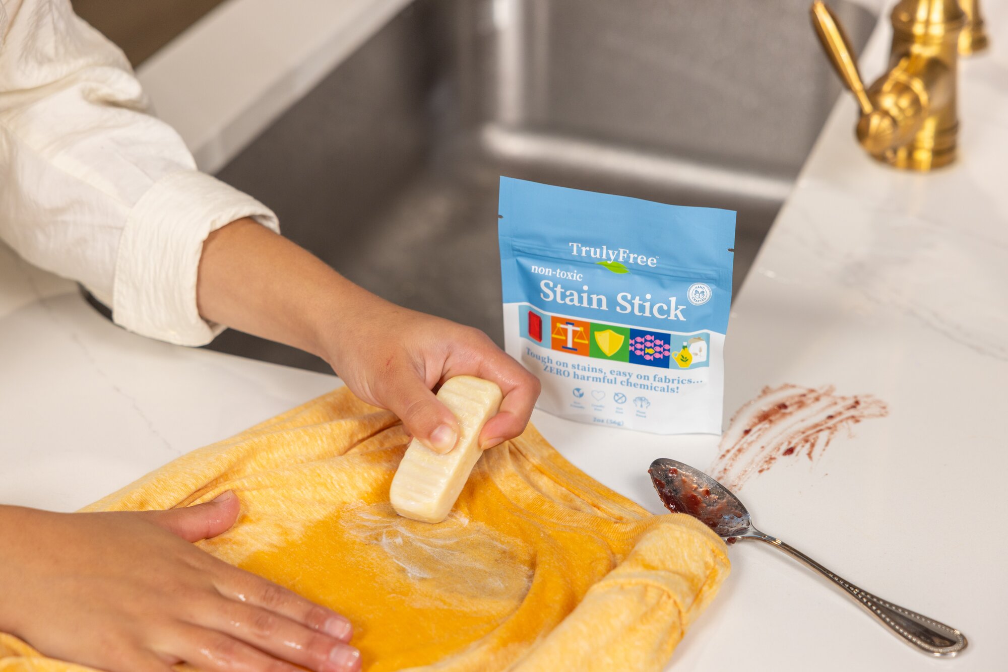 1. Scrape Off Excess Jam - Lift off any thick or sticky jam using a spoon or dull knife. Be careful not to grind it into the fabric.